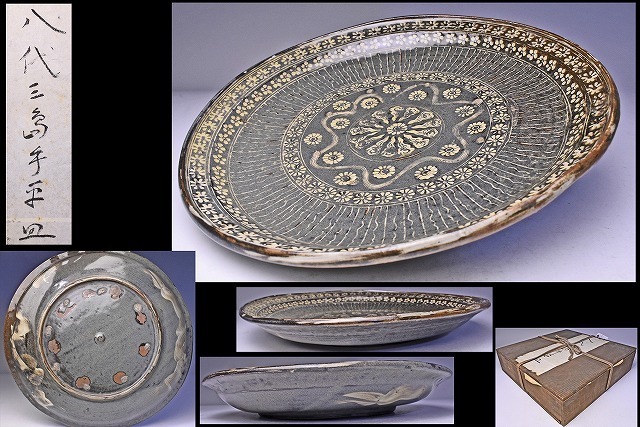 > 時代 八代焼 ★ 三島手 大皿 ★ 木箱 ★ 高田焼 ★ 熊本県 民芸陶 ★ 尺皿 ★丁寧な象嵌と高麗李朝古陶磁を思わせる深みを感じさせる上作
