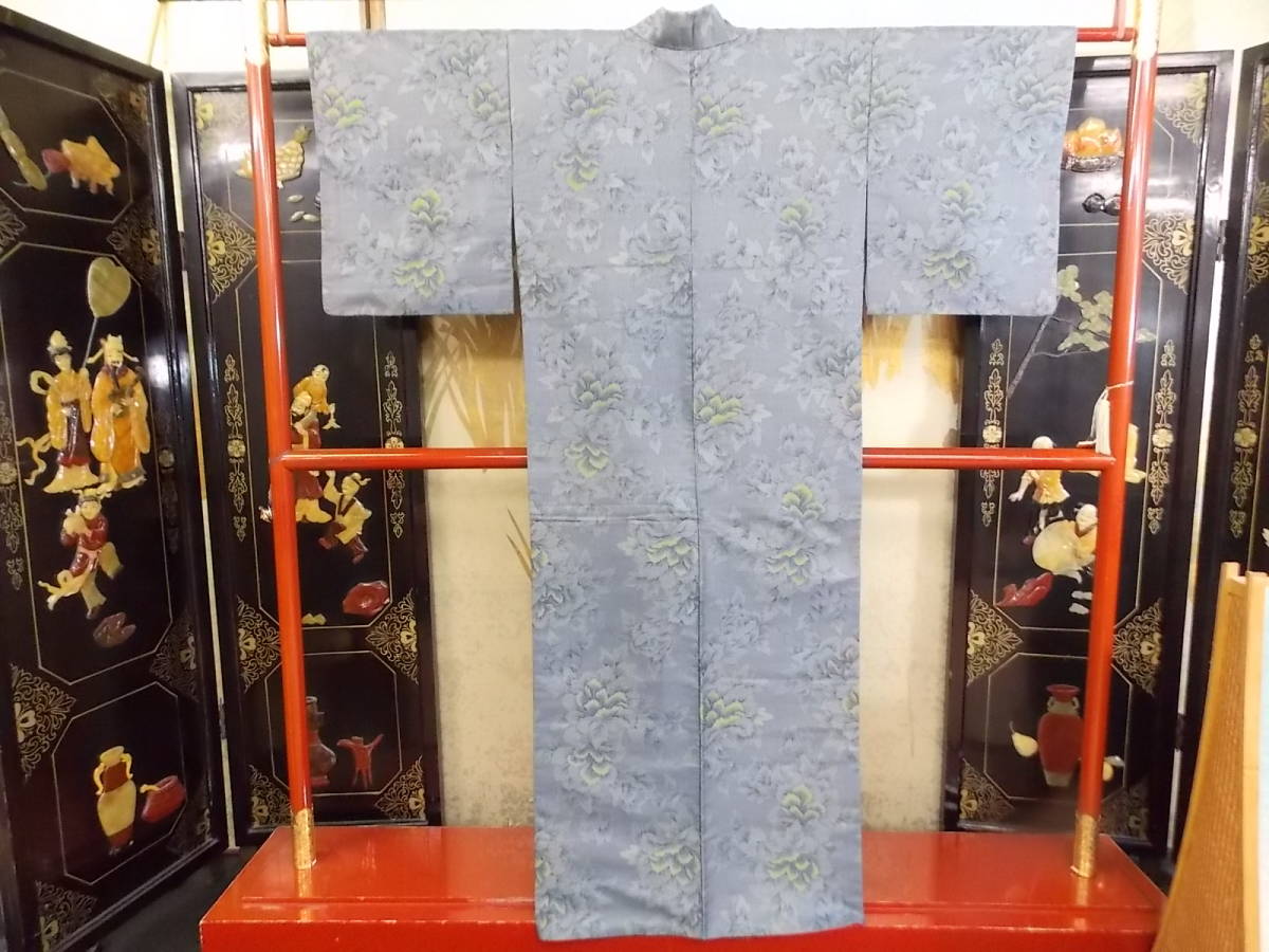 > きもの今昔3767 御召のきもの 袷広衿仕立て ブルーとグリーンの色で十字小絣の牡丹の花