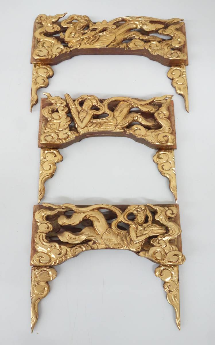 - 時代物 仏教美術 仏教建築 *木製彫刻 装飾 仏壇 仏具 *木製 彫刻 金彩 雲 天女 三枚*寺院実使用品 実際の寺院の装飾品
