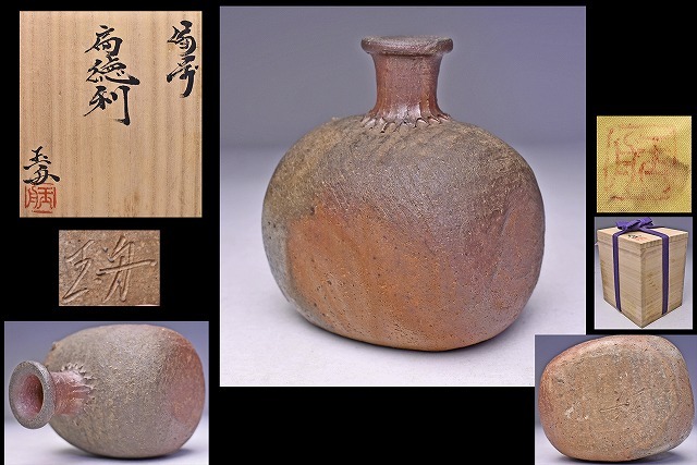> 木村玉舟 ★ 備前 扁 徳利 ★ 共箱 共布 ★ 17代 木村宗得 ★ 陶彫家 ★ 氏らしい造形の良い逸品 ★ 酒器 ★