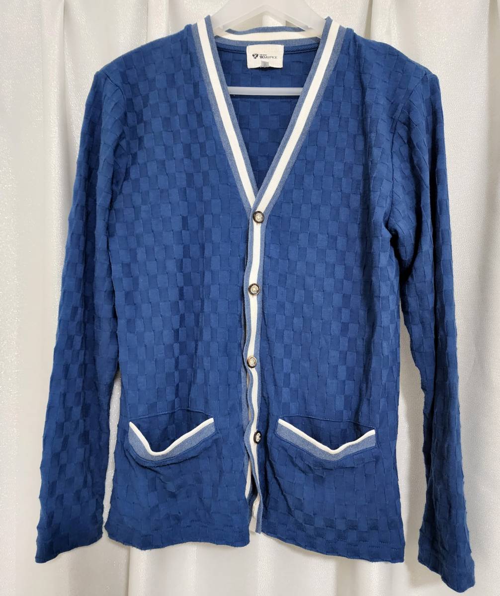 - 薄手 異素材模様カーディガン ブルーx白ライン 美品