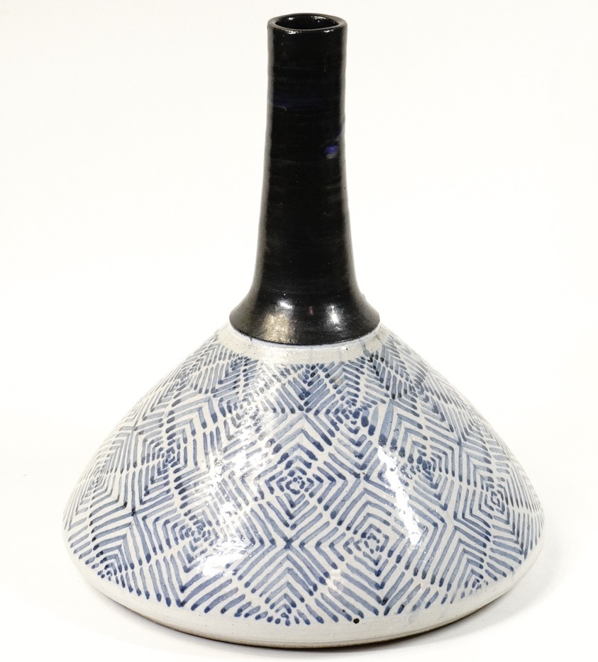 > 昭和ビンテージ 染付一輪挿し 総柄 作家物 在銘品 共箱 極上状態品!染付の青と黒釉首の意匠が素晴らしい逸品 直径20cm X 高さ22.5cm KIN