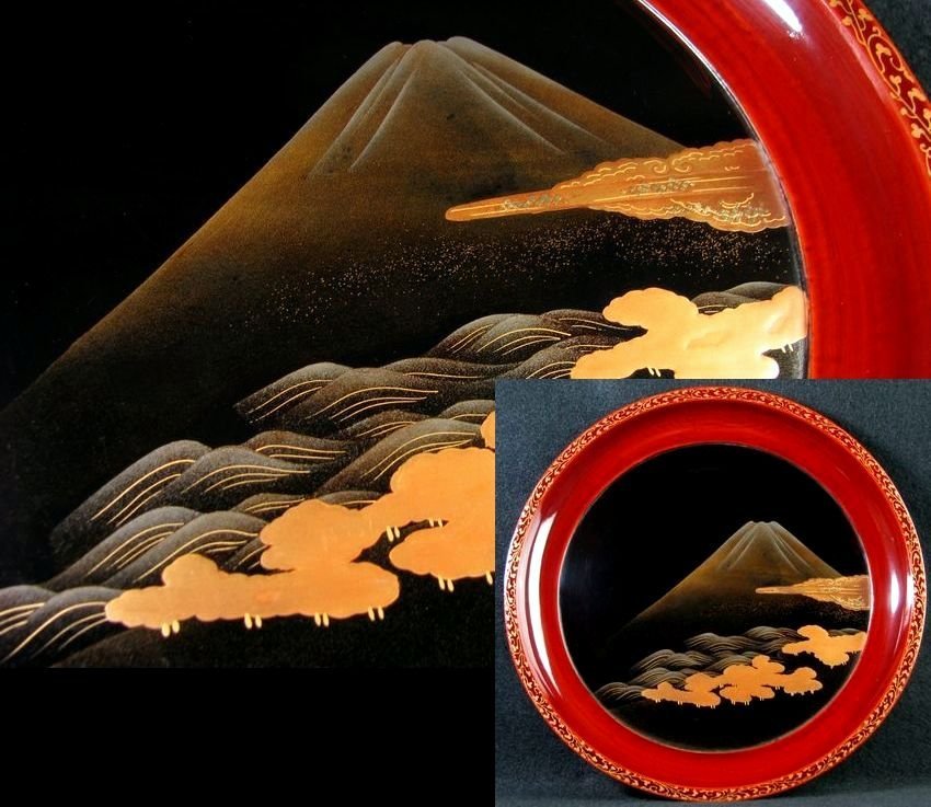 - 時代 蒔絵の丸盆 No3 研ぎ出し蒔絵 富士・樹海の図 幅:25cm ※複数枚有/22f035