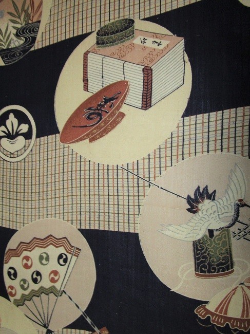 > 男4-76★祝い柄*古書*寿*器*鶴*扇*壺*正絹-古布はぎれ★一貫張り/襖絵/屏風絵/アンティーク/文化人形/リメイク