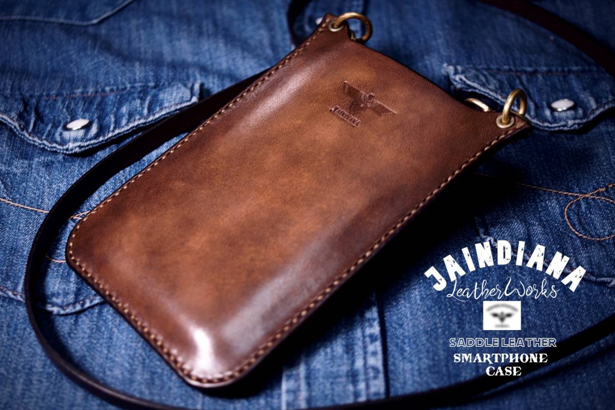 > ハンドメイド サドルレザー ショルダースマートフォンケース ビンテージ染めブラウン