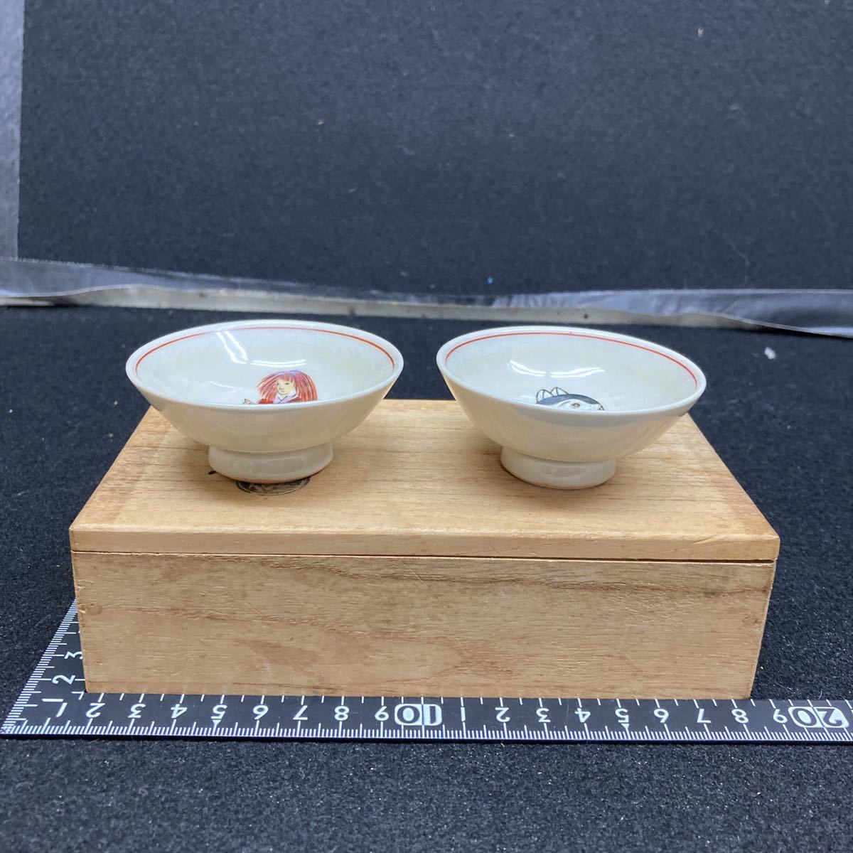 - 九谷光仙作 人物、猫絵 盃 一対 共箱付き 陶印有り アンテーク