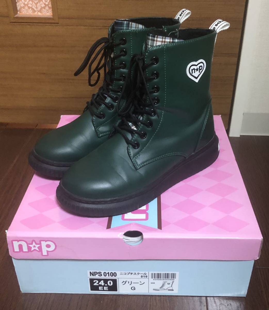 - ニコプチスクールロゴバッチリ!深めグリーン×チラ見えタータンチェック柄が可愛いガールズブーツ24.0EE レインブーツ使用回数少なめ美品