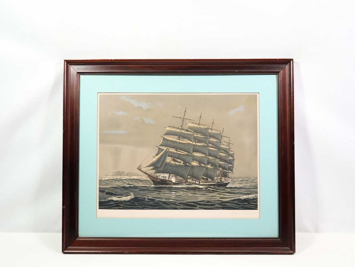 - 真作 リチャード・リントン 1980年リトグラフ「タヒチ島上陸」画寸 46cm×33.5cm オーストラリア人作家 帆を孕ませ荒波を突き進む帆船 6198