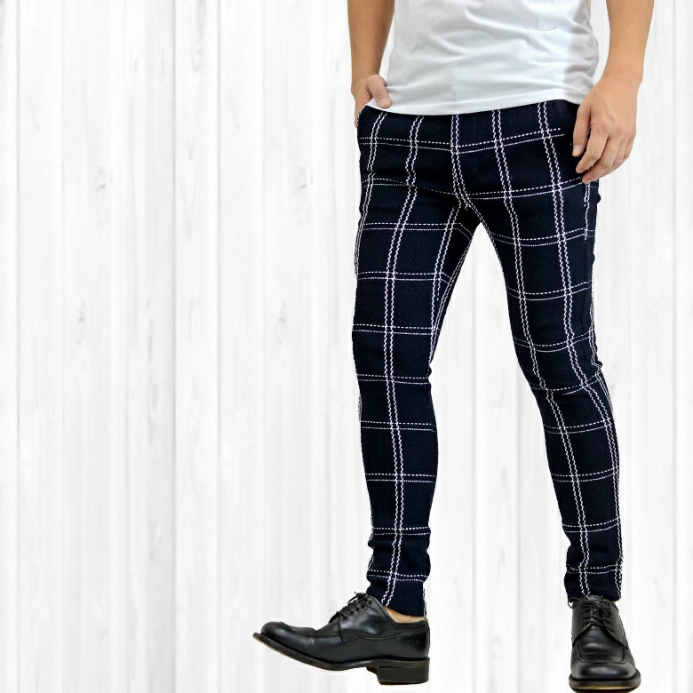- チェック刺繍細身テーパードパンツ01461新品ネイビーxホワイトL
