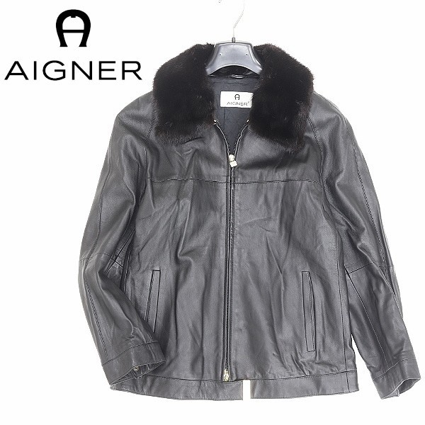 > 国内正規品●AIGNER アイグナー ミンクファー襟 ラムレザー ジャケット 黒 ブラック 42