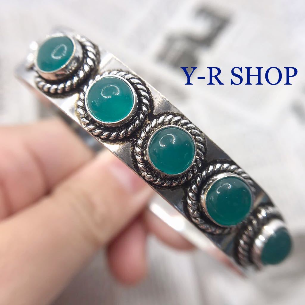 > 天然石★ブルーグリーンオニキスのアンティーク調バングル★レディース腕輪ブレスレットカラーストーン エスニックインドY-RSHOP新品宝石