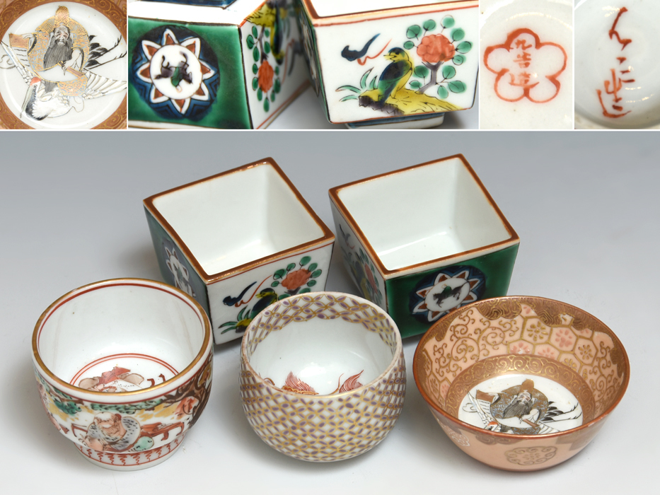 > 明治期~大正期 九谷焼金彩色絵盃5客 庄三 樹下人物 麒麟図 花鳥図 鶴に人物 酒盃 酒杯 酒器 杯 美品 時代箱 懐石道具 ぐいのみ z3930o