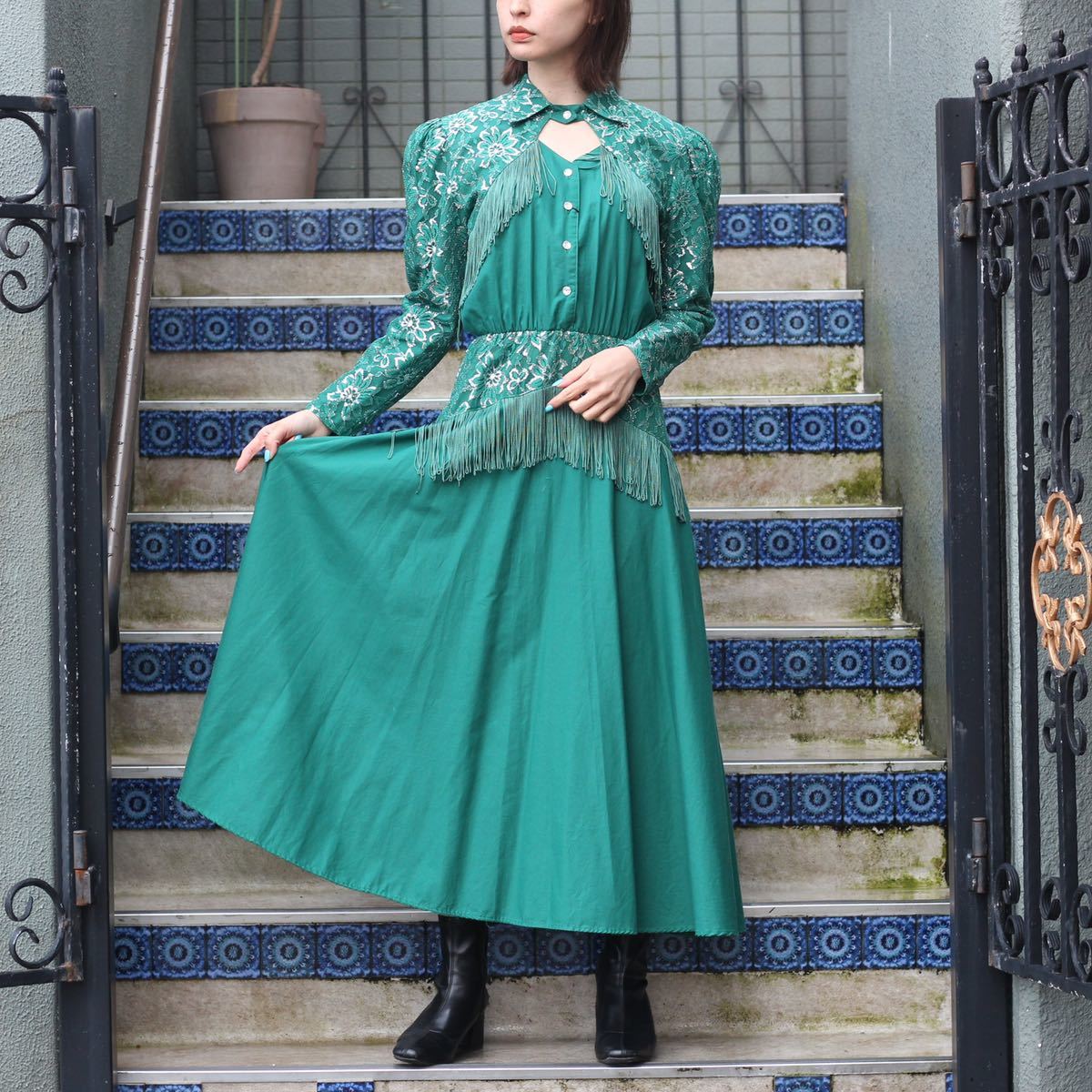 - *SPECIAL ITEM* 80's USA VINTAGE Lilian Smitty MADE IN USA/80年代アメリカ古着お花レースフリンジデザインロングワンピース