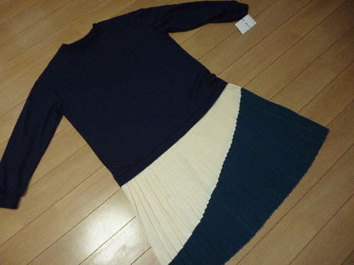 - 送料無料★お洒落な紺系・プリーツ加工・長袖ワンピース★未使用・タグ付き