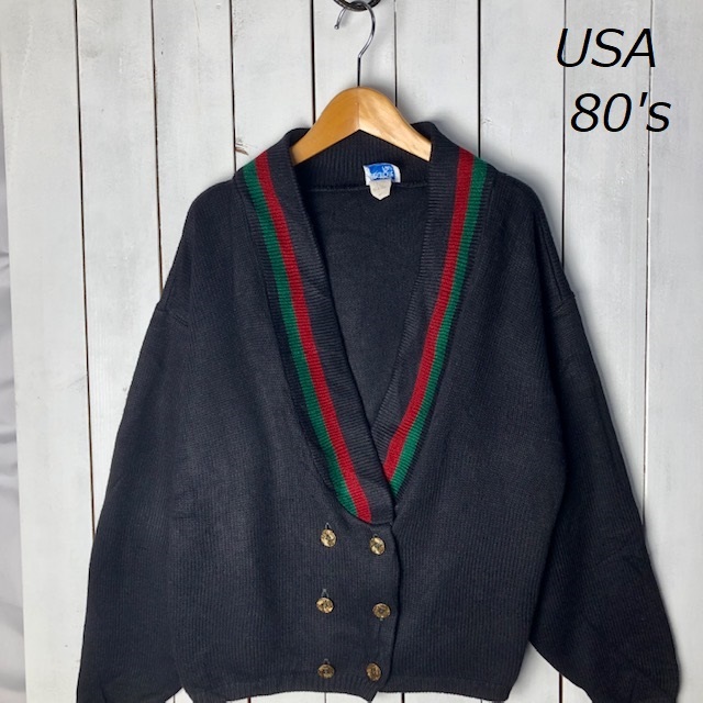 - USA古着 80s USA製 アクリル ダブル合わせカーディガン M~L 黒 オールド ヴィンテージ アメリカ古着 アクリルニット 赤緑ライン ●203