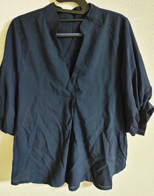 - Mサイズ BODY DESSERT 半袖 ブラウス Vネック? スタンドカラー 紺色