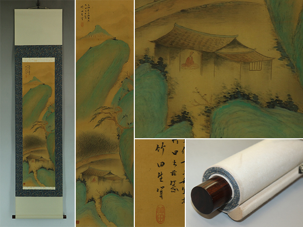- 【真作】田能村竹田【彩色山水】◆絹本◆合箱◆掛軸 u11037