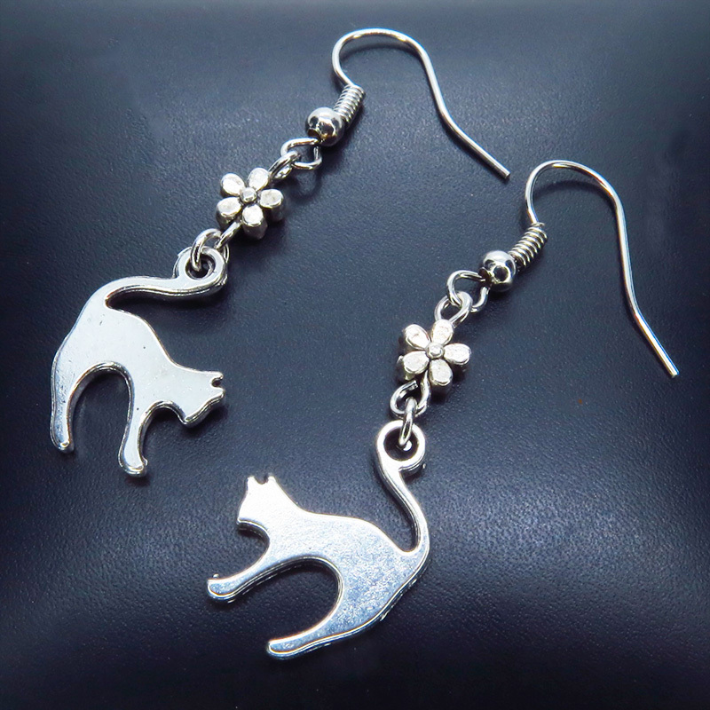 - アンティークシルバー 跳ね猫と花のチャームを組み合わせたコンパクトなピアス サージカル可