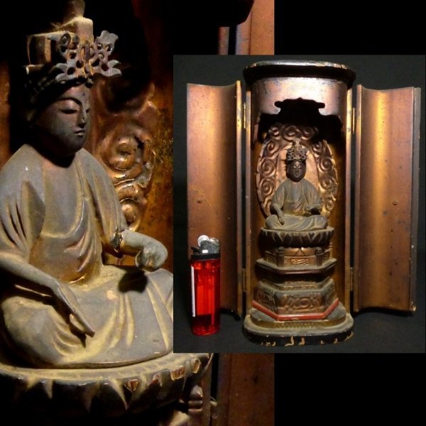 【 恵 #0441 】木彫 金彩 細密彫刻 観音菩薩坐像 厨子入り 検:仏教美術/観音/観音菩薩/厨子拍卖