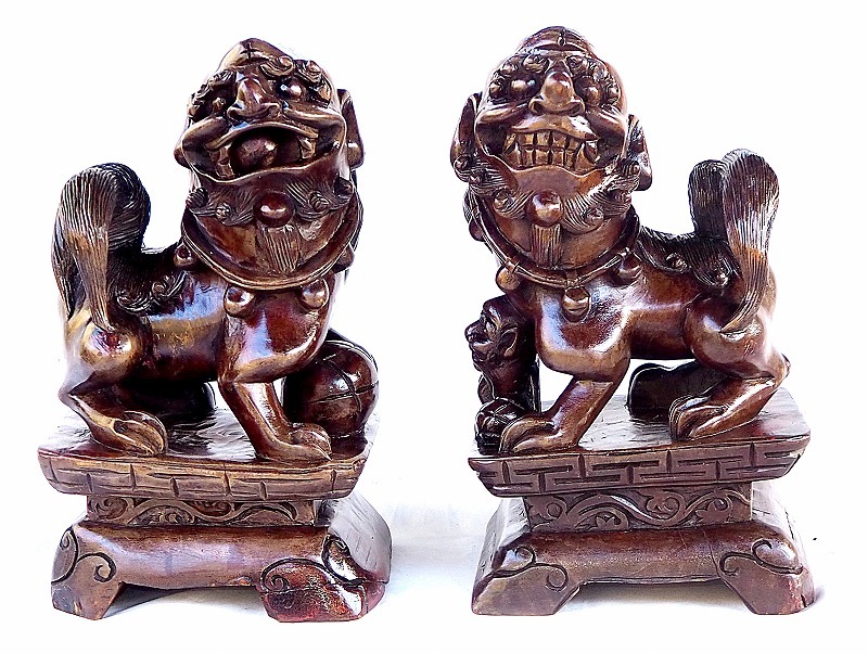 - 木彫りの狛犬 シーサー 魔除け 一対 中古品 唐獅子