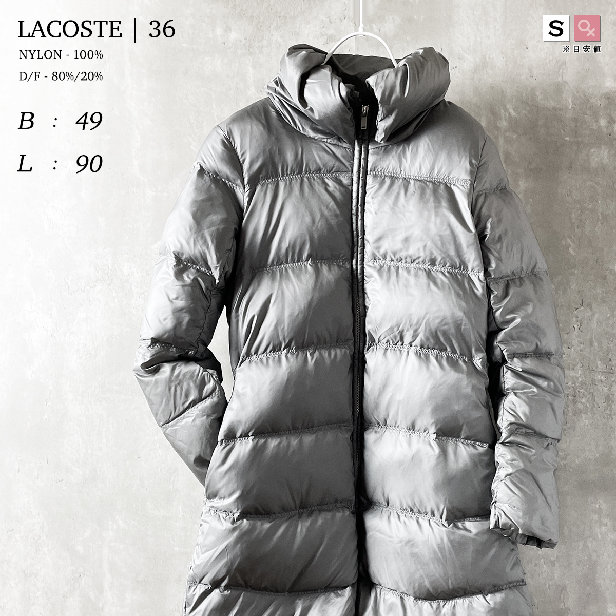 > LACOSTE 厚手 ロング ダウン ジャケット 灰色 グレー 銀 シルバー 冬 スタンドカラー ハイネック 中綿 ナイロン 100% 無地 ラコステ 36 7号