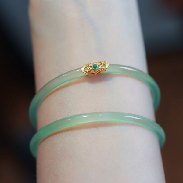 - [EasternStar] 天然 玉髄 瑪瑙 バングル 極細 レディーズ 腕輪 14K 金メッキ アップルグリーンチャコールブレスレット 松石如意金 ペア