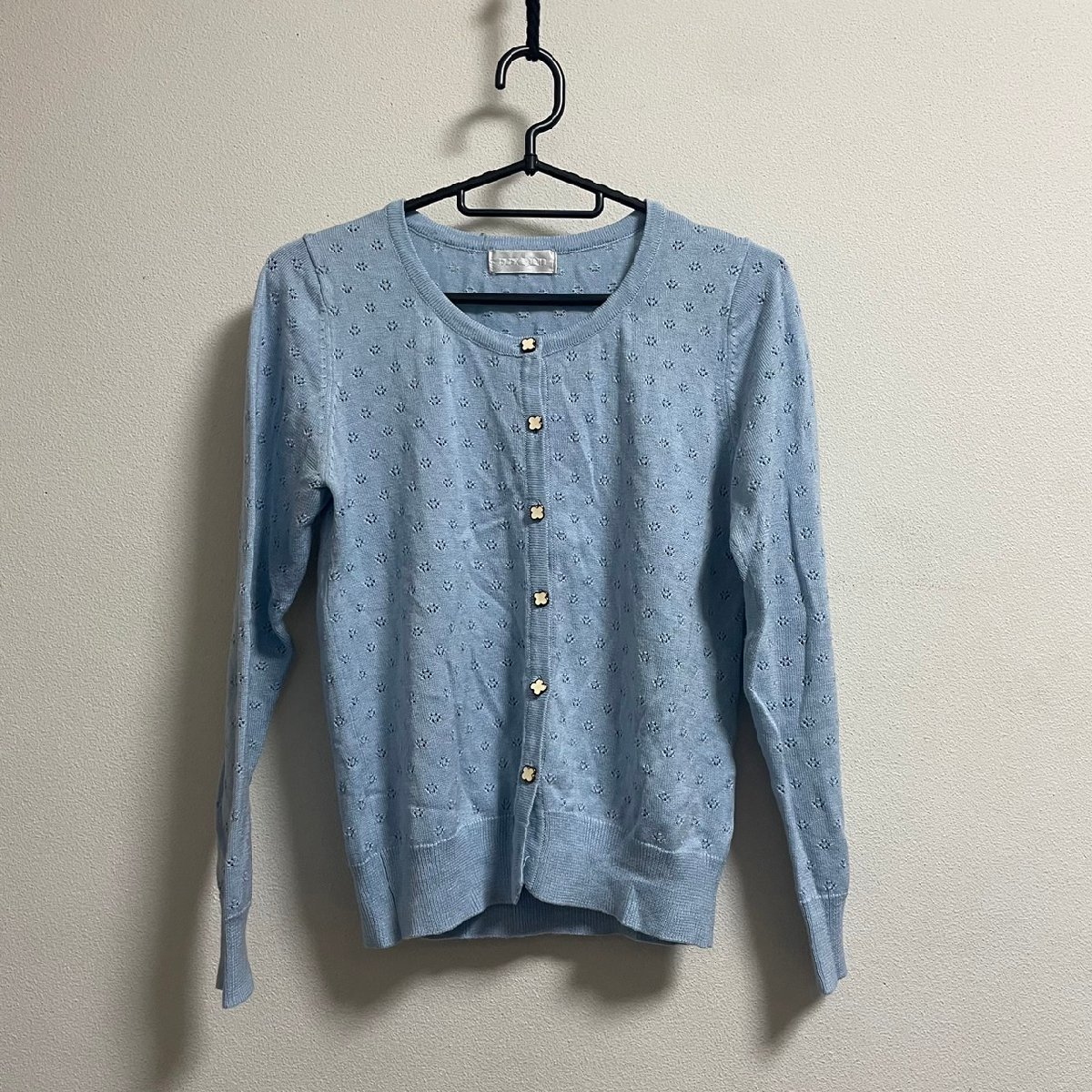 - カーディガン ニット ブルー FLEX MIND フレックスマインド クルーネック 長袖 レディース 透かし編み サイズM