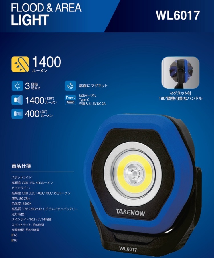 > TAKENOW WL6017 充電式LEDランプ/FLOOD & AREA LIGHT USBケーブル付き