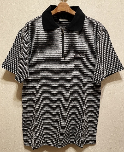 > 美品USA製ハーフジップ90sオールドBUGLE BOY黒マルチ編み柄ボーダーTシャツLビッグシルエットMコットン刺繍ロゴUS製ビンテージ90年代ポロ