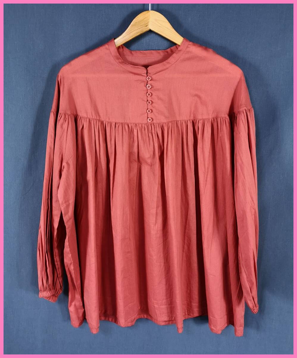 > WH‐75☆春夏秋☆新品☆送料込み☆即決☆ナチュラル系☆薄手のインド綿☆M~Lサイズ☆ブラウス☆ピンク系☆ギャザー☆ゆったり