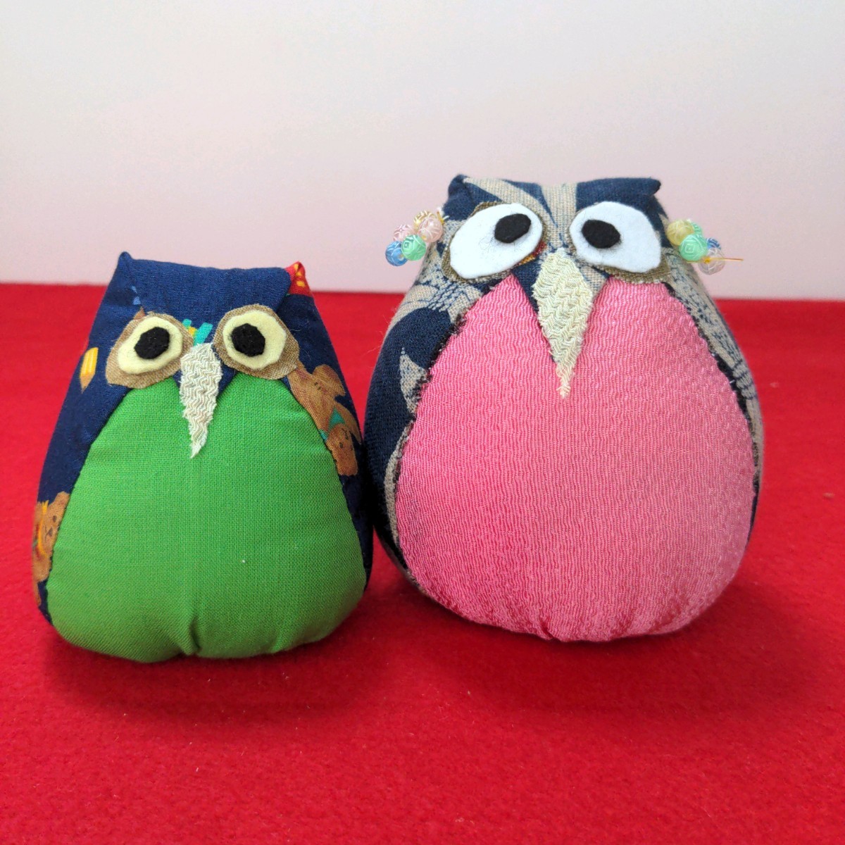 - ふくろうの置物 古布製 ハンドメイド おばあちゃんの手作り 起き上がりこぶし 高さ約8.7cm、11cm 親子 ピンク グリーン 藍色