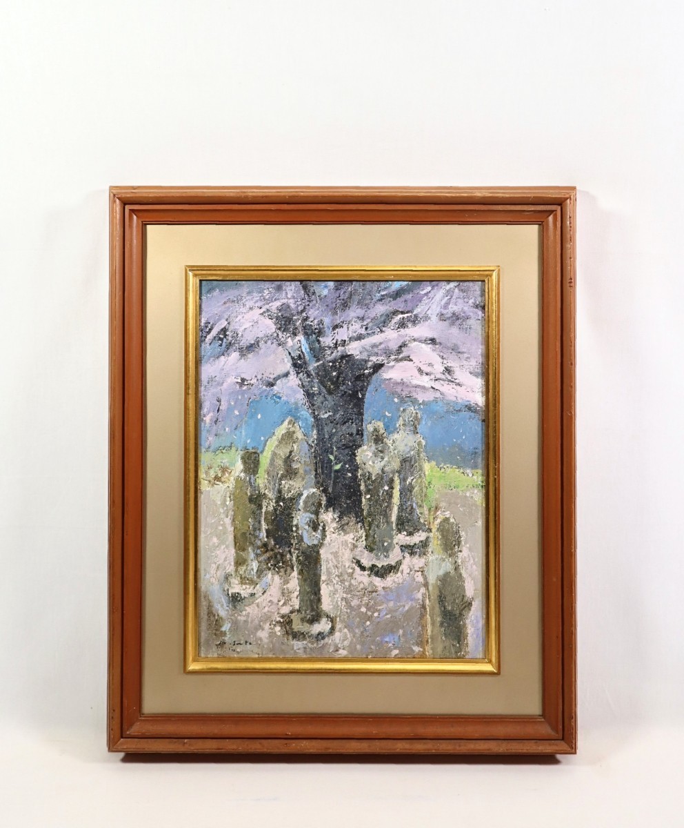 - 真作 斎藤政一 1972年油彩「花吹雪」画寸32cm×41cmF6 埼玉県出身 一水会常任委 日展審査員 田崎広助に師事 一枚の繪 斉藤政一 7463