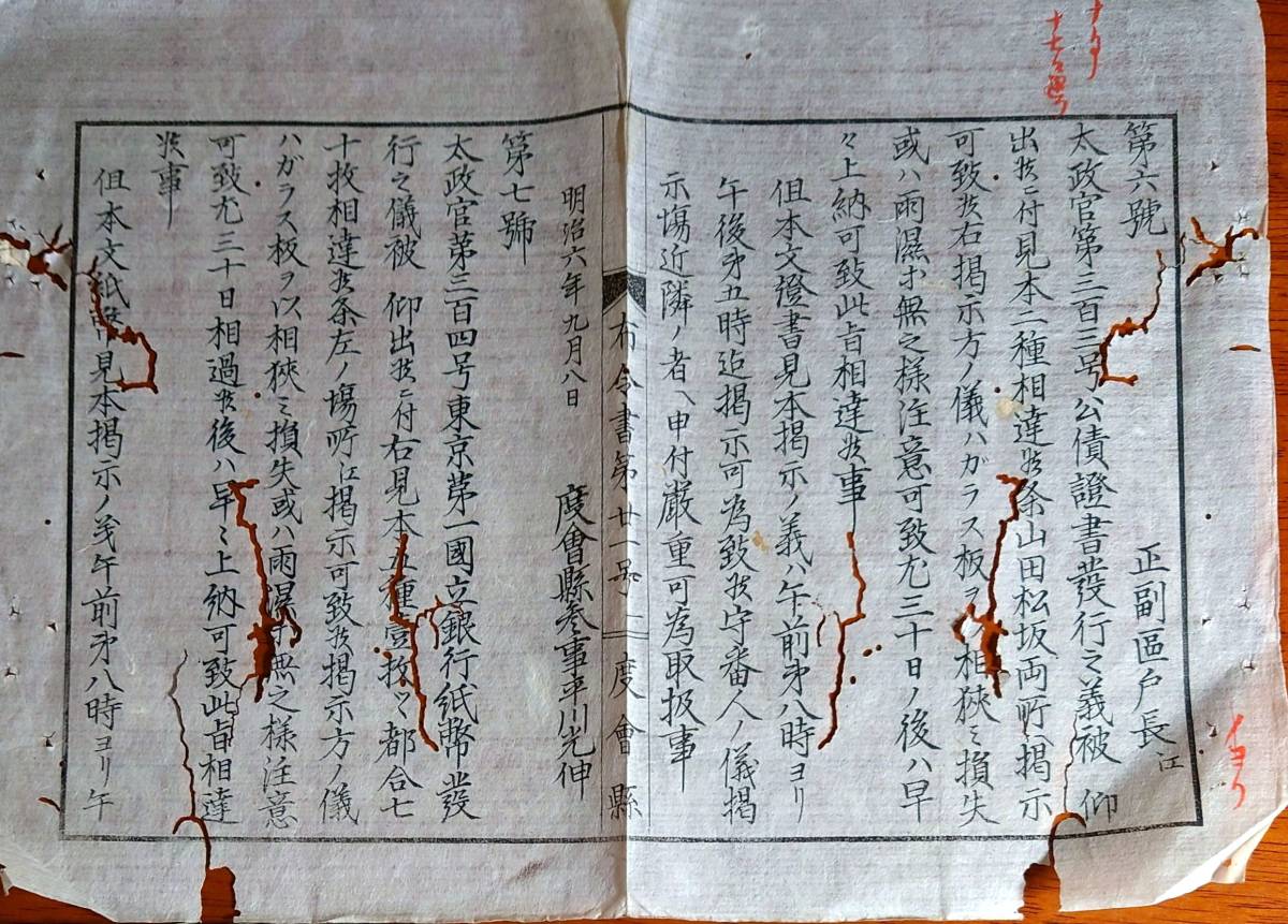 - f23051601〇明治布告布達 東京第一国立銀行紙幣発行の儀 見本5種 山田 松坂 鳥羽 度会県 三重県 明治6年〇和本古書古文書