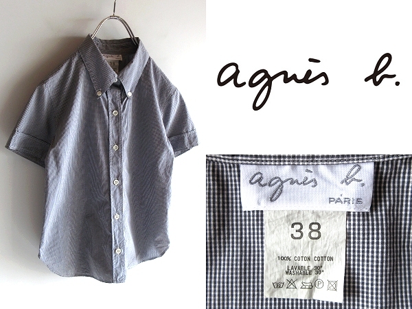 > 希少 90s-00sビンテージ agnes b. アニエスべー コットン マイクロチェック柄 半袖 BDシャツ ブラウス 38 ブラック ホワイト ネコポス対応