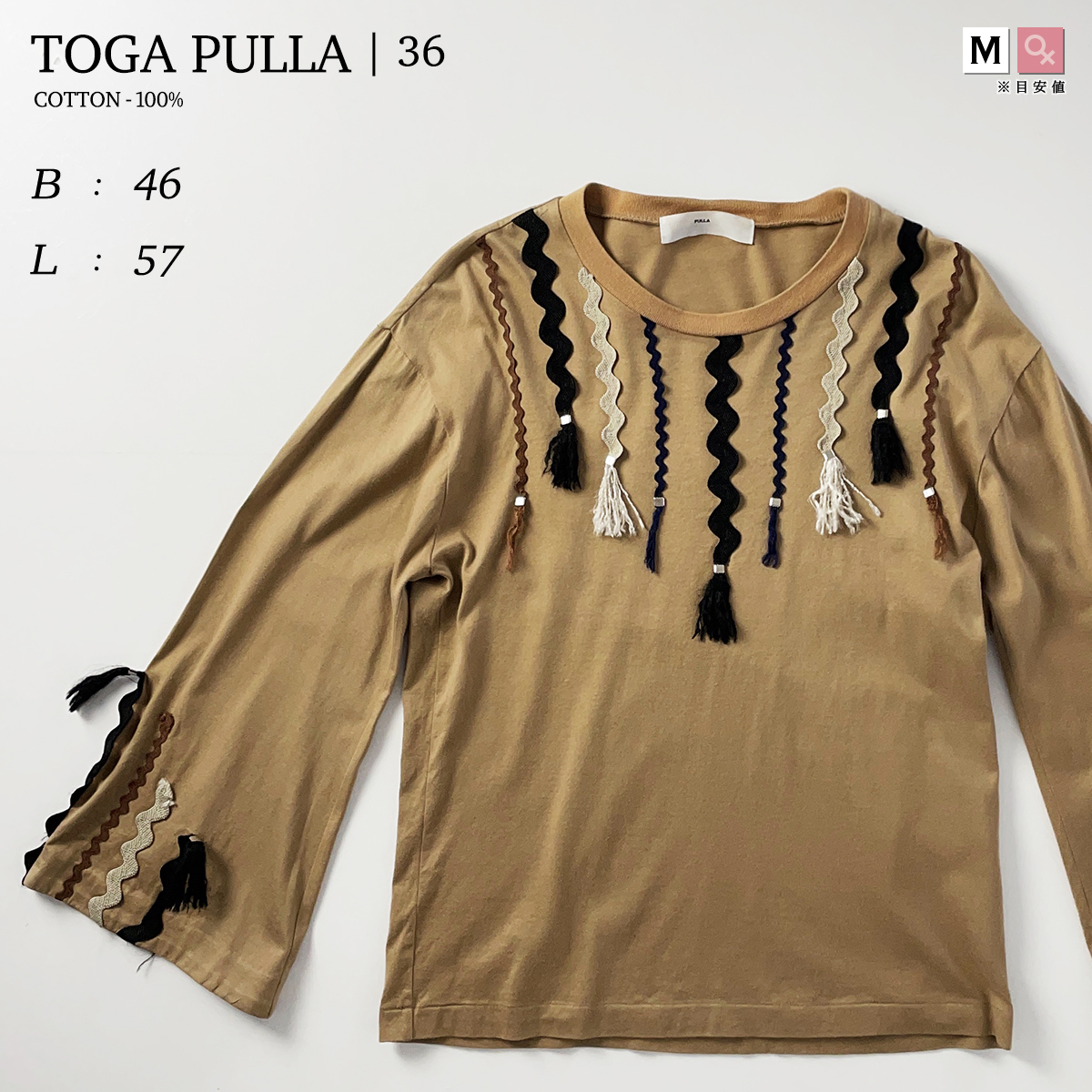 - TOGA PULLA 刺繍 フレアスリーブ 長袖 Tシャツ ベージュ キャメル ブラウン ストライプ 柄 総柄 ロンT 薄手 綿 丸首 トーガプルラ 9号 36