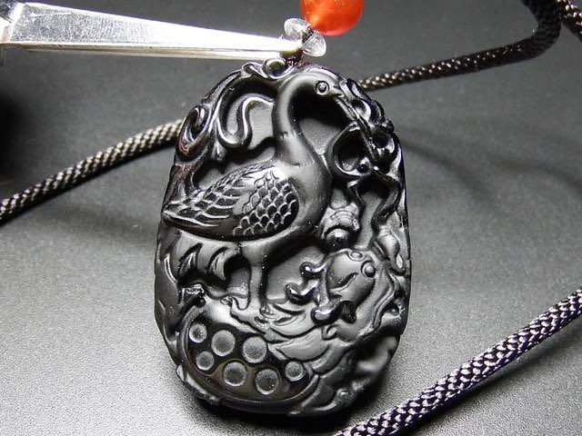 - 展示品鶴亀長寿天然石オブシディアン鶴亀彫り縁起物ネックレスプライム