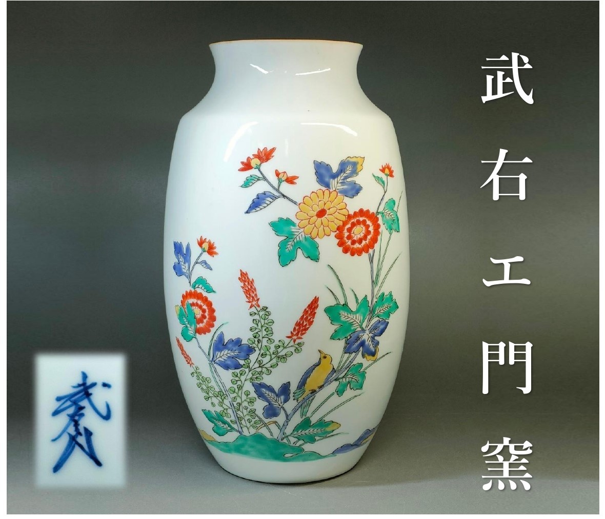 > 有田焼 武右衛門窯 色絵花瓶 花蝶図 高30.5cm 飾り物 置物 日本伝統工芸美術 焼物 陶器 骨董 古美術 芸術 華道具 茶道具
