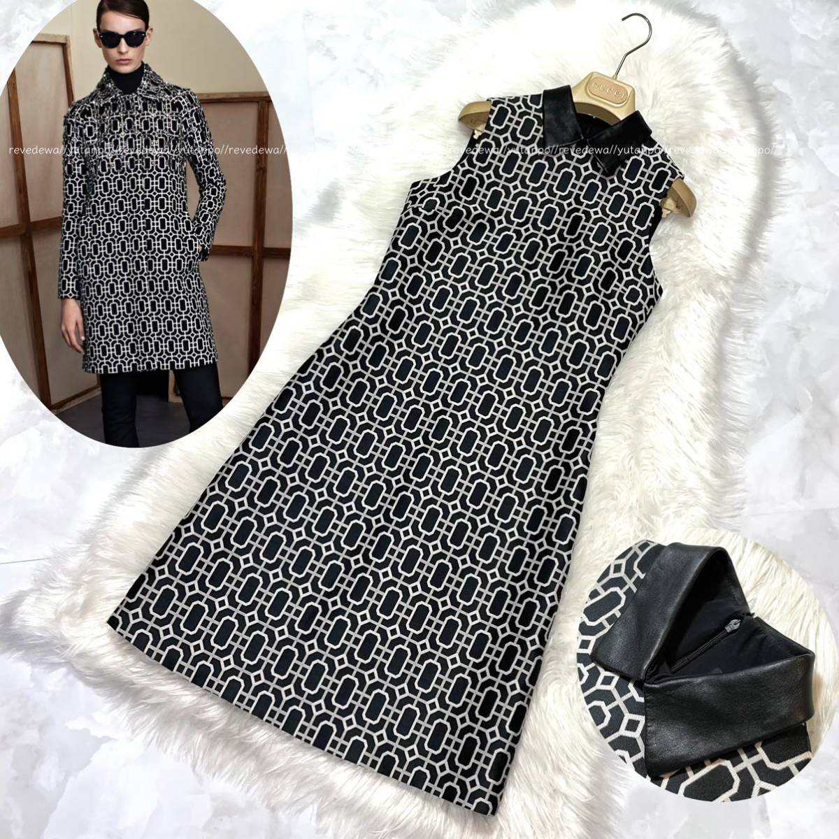 > 週末クーポンで4000円引き!! 本物 美品 グッチ レザー襟 総柄 ノースリーブ ワンピース ドレス 黒 白 36 GUCCI