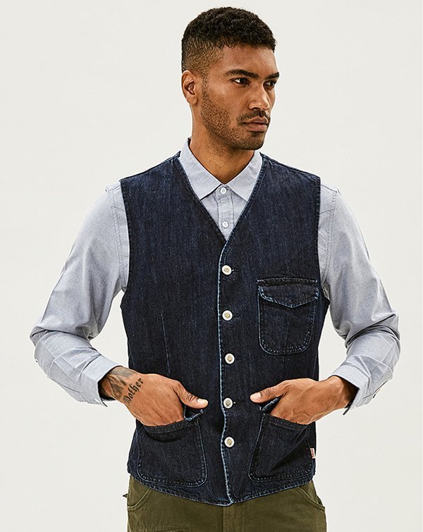 - LHH124★春夏 デニムベスト 13.5OZ 無地 フィット ワークベスト 100%コットン スリム メンズ 紳士用 ウォッシュ加工 バックルバック S