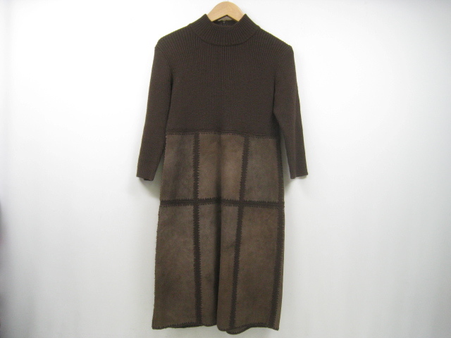 - BRAHMIN ブラーミン ワンピース 七分袖くらい ニット レザー ウール ピッグレザー 茶 ブラウン