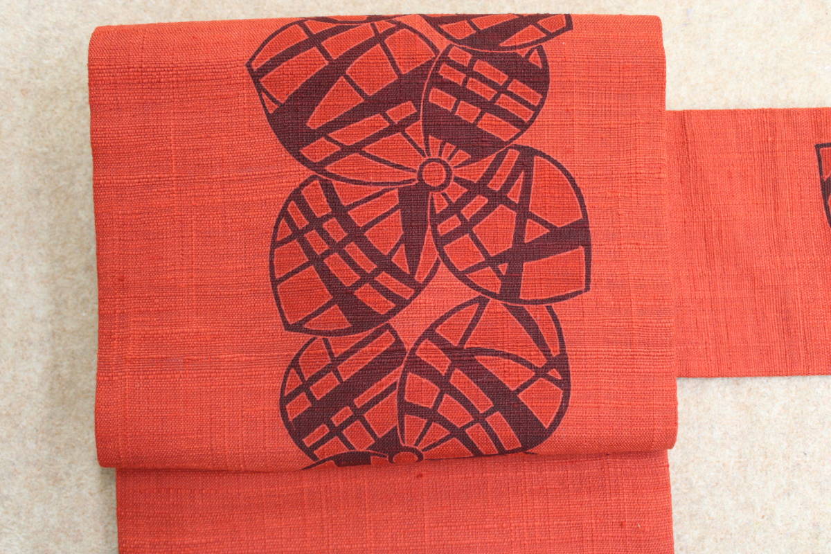 - きもの今昔5272 名古屋帯 正絹ザックリ紬 レンガ赤色地墨色の花柄デザイン 未使用品 帯の長さ355cm