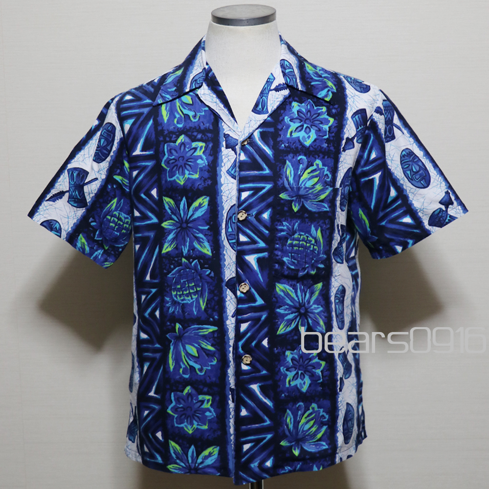 - アメリカ購入品 USA製 美品 ui-maikai ウイマイカイ コットン アロハシャツ TIKI&植物ボーダー柄 青白 M