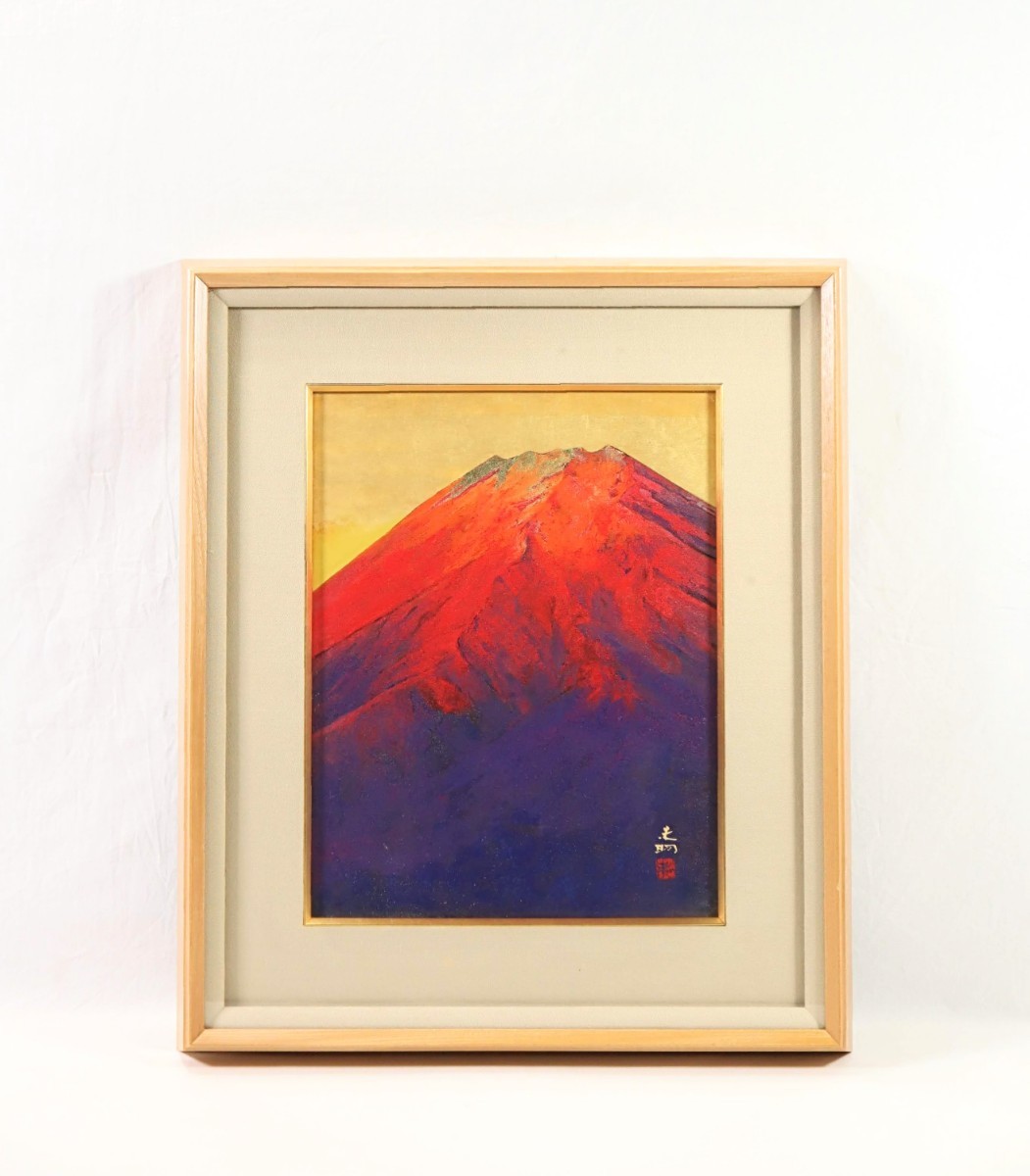 - 真作 竹内未明 日本画「紅富士」画寸32cm×41cm 6号 福井県出身 青龍社社人 川端龍子 堂本印象に師事 焼けた山肌と頂の神々しい黄金色 7732