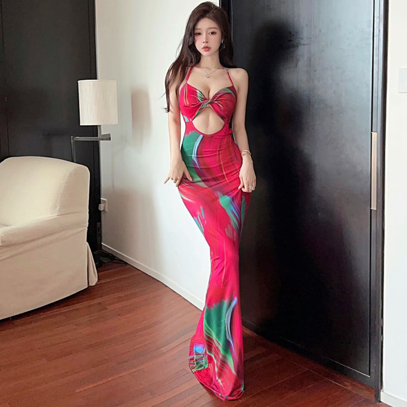 - 上質 ワンピース新品魅惑Styleセクシー とろみ素材 ホルターネック 前開き 総柄 裾 フレア ロング ワンピース ドレス 結婚式 パーティ