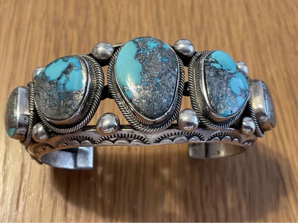 > 【超希少】アーノルドグッドラック ナバホ イサカピーク ナチュラル ターコイズ バングル パイライト 水晶入りstrling 作者刻印