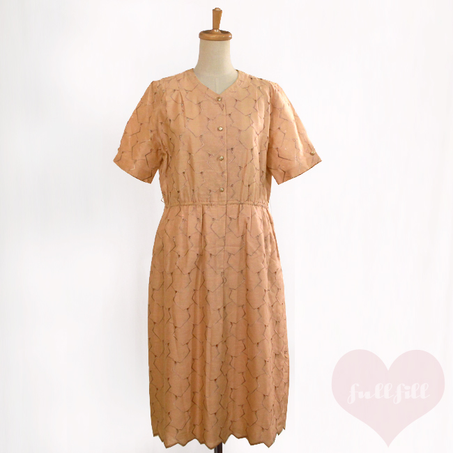 - ワンピース 古着 昭和 レトロ 刺繍 半袖 ピンクベージュ 麻混 ビンテージ ヴィンテージ vintage 70s 80s ガーリー used コットン くすみ
