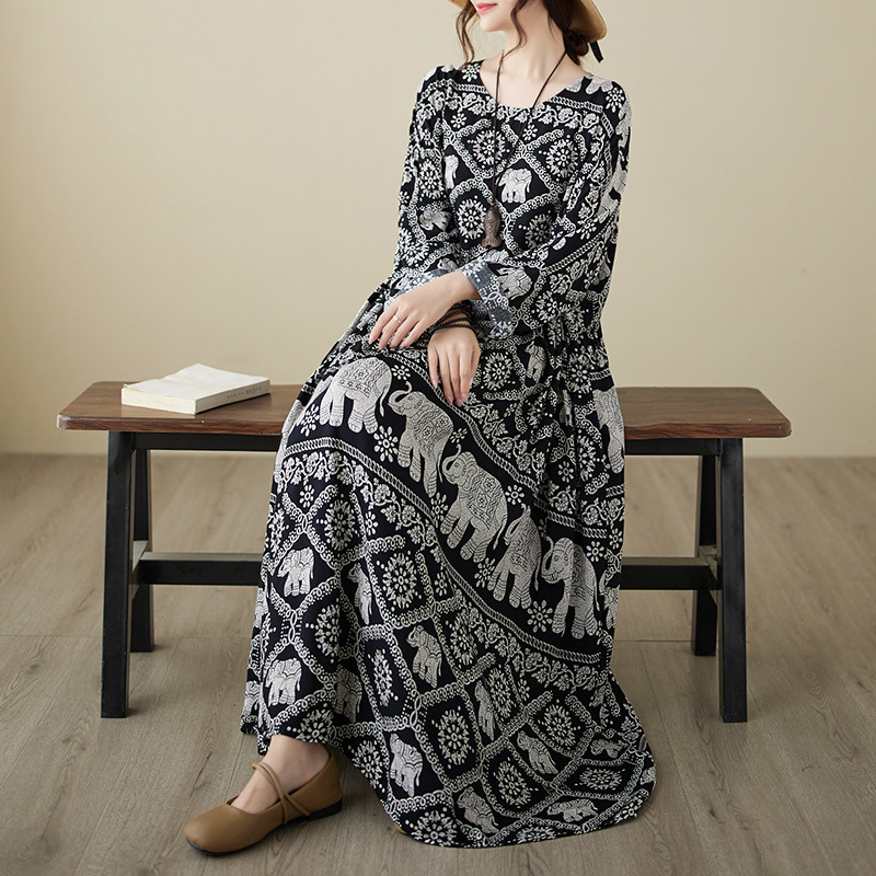 > 「同梱1万円送料無料」 秋新作**レディース*カジュアル*復古*プリント*ゆったり大きいサイズ*体型カバー*ロング丈ワンピース*黒