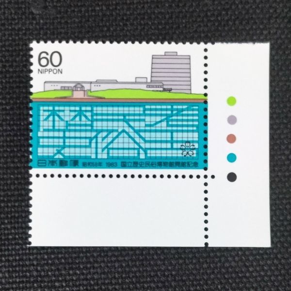 > [23082616]【国立歴史民俗博物館開館記念】単片 CMカラーマーク付「歴史民俗博物館とデザイン化した文字」60円 1983年発行 美品*