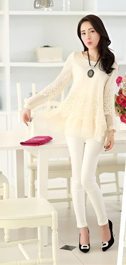 - 45-3.ブラウス シンプル トップス チュニック 刺繍 レース シフォン 長袖 白 XL