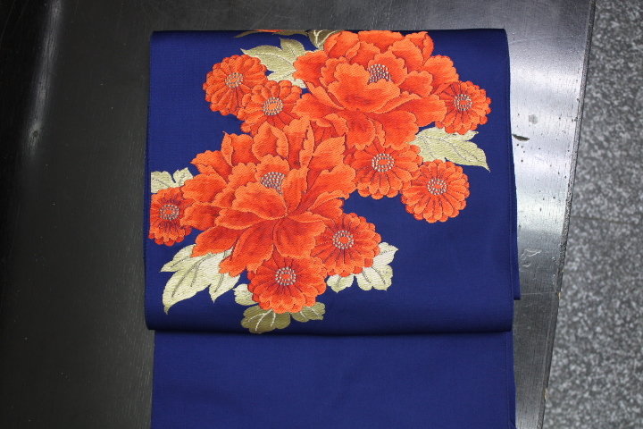 > きもの今昔5780 名古屋帯 交織緞子八寸かがり帯 御太鼓と前腹に赤い牡丹と菊柄 帯の長さ360cm